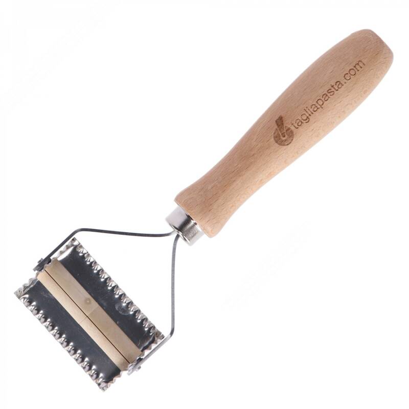 Dit gereedschap voor het snijden van verse pasta heeft een praktisch houten handvat en 2 getande stalen messen (diameter van 36 mm) die per rotatie een strook van 56 mm breed vormen en 2 vierkanten deeg vormen.
